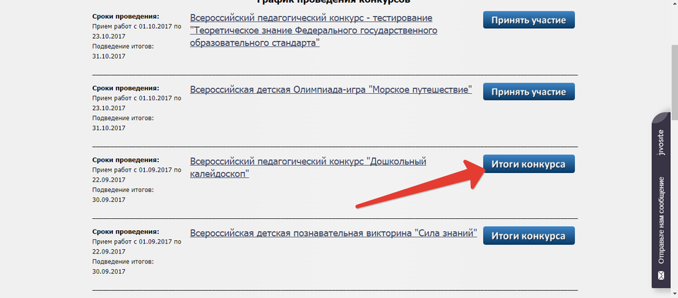 Выбрать нужный конкурс и нажать на кнопку «Итоги конкурса»
