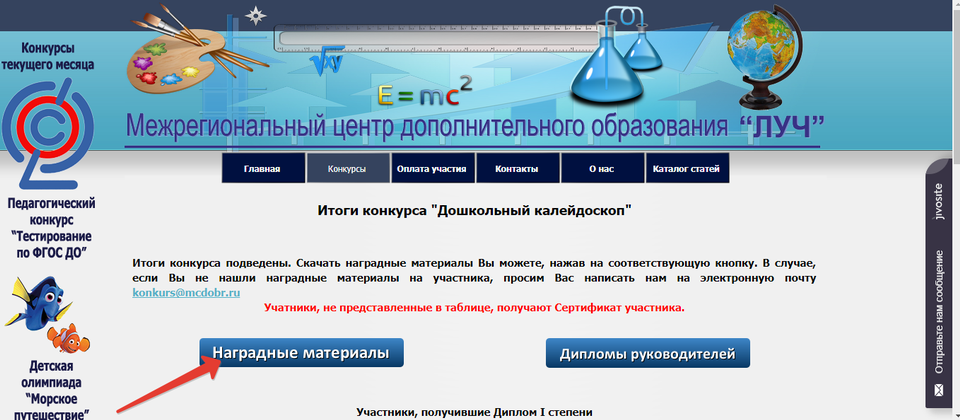Согласно положению о проведении конкурса, наградные материалы скачиваются участниками самостоятельно со страницы конкурса. На страницу конкурса можно попасть следующим образом: